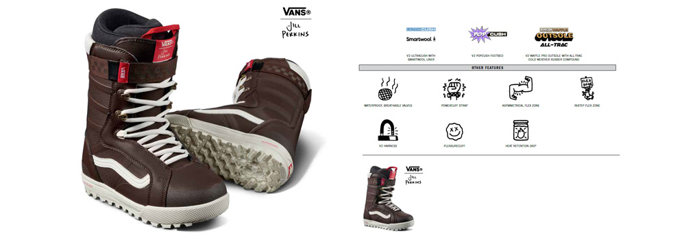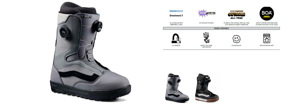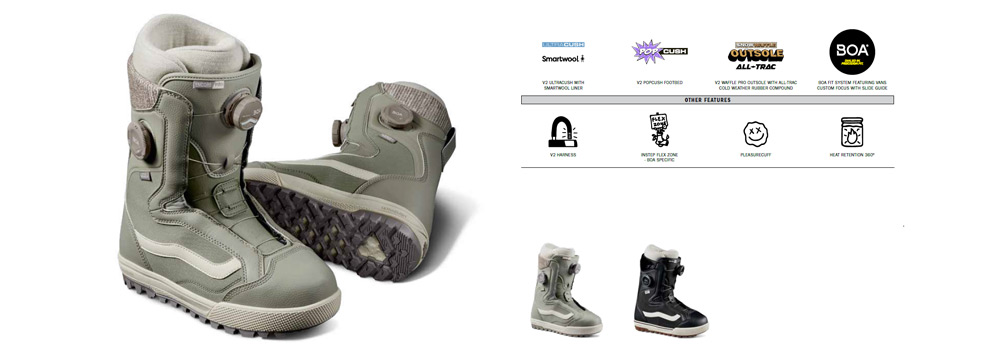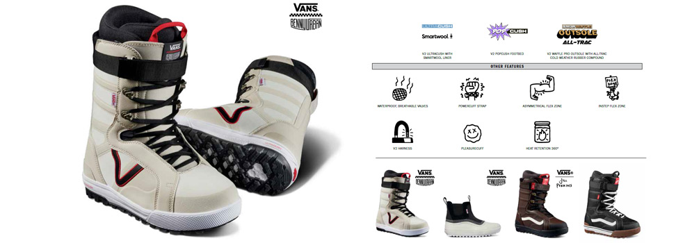 Vans 特有的傳統反向華夫格花紋外底,不論於雪地和街頭上都能提供高水準的板感和牽引力。部份使用了具有微調功能的 BOA 鞋帶系統更能獲得更好的精度和可操作性。 透過 Vans Snowboard Boots 改良的靴子貼合度、靴子彈性選項和 360 度保暖層,讓僚用者都能享受到全天舒適感。Vans Snowboard Boots 滑雪鞋設計均以經典板仔鞋款式做藍本,襯上任何造型的滑雪服都能配撘自然美觀,去任何地方都很方便。